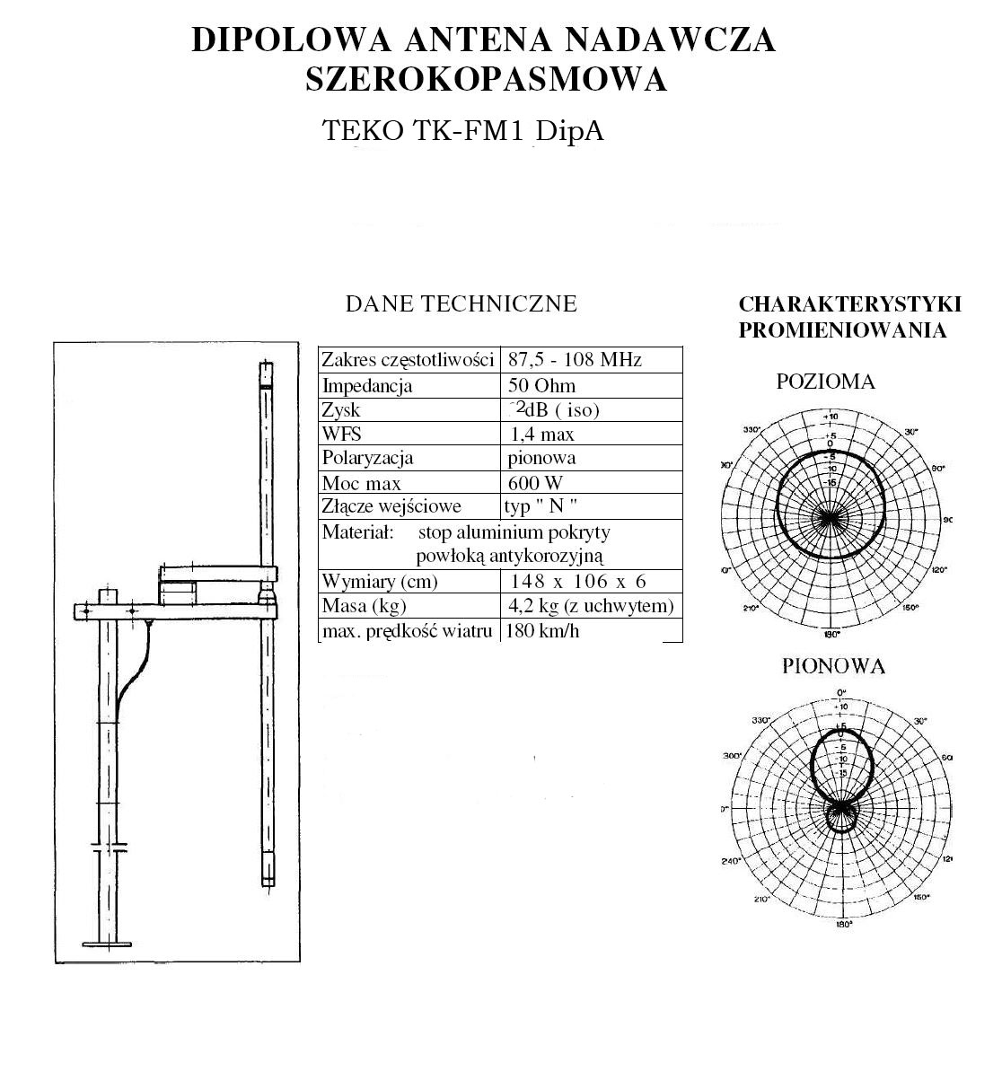 FM_Antennas TK-FM1-DipAN FM antenna wideband 88-108 Mhz, dipole vertical polaritation, max input power 600W, input connector N female, Brackets included. Aluminum 1szt. Coax_Cable CCFRG213 Coax Cable Foam RG213U at 100MHZ Att=6,2dB Max Power=1kW 30m Connectors CNNFRG213 Connector N for Foam Cable RG213 2szt. Connectors CAGNDKITRG213 Connector Accessory Grounding kit for RG213 cable (1pc. x cable) 1szt.