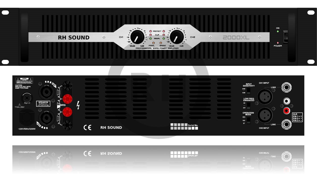 RH SP400QL Stopień końcowy mocy. Moc wyjściowa RMS 2 x 200 W/4Ohm, 2 x 130 W/8Ohm, 1 x 400 W/8Ohm. Wskaźniki: wysterowania LED, LIMIT, BRIDGE, POWER. Pełne zabezpieczenie przeciwzwarciowe, przeciążeniowe oraz termiczne. Wymuszone chłodzenie przy pomocy w
