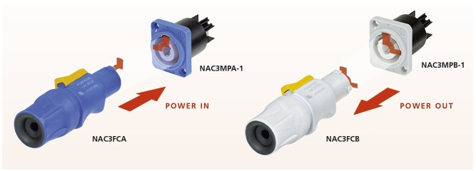 PowerCON FXXA/FXXB to jednofazowe (3-przewodowe) blokowane złącze zasilania z funkcją przerywania obwodu po połączeniu z gniazdami serii powerCON XX.